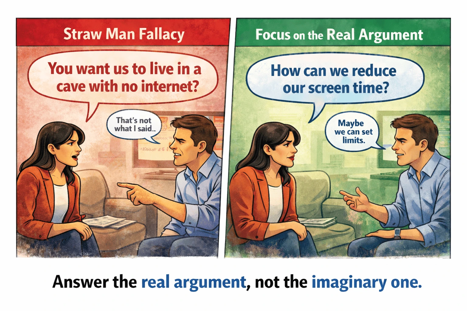 That’s the straw man fallacy: Replacing someone’s real argument with a more extreme, easier-to-attack version—and then arguing against that instead.